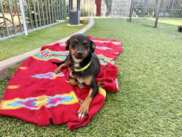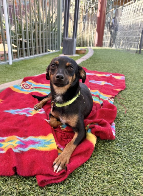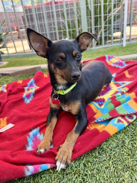 Holiday is a 1 year old Miniature Pinscher mix weighing just 8 pounds, and she packs a whole lot of joy into her tiny frame. When she sees people, she wiggles her entire body with pure excitement, it’s impossible not to smile around her! This sweet, friendly girl gets along wonderfully with other dogs and has a naturally happy, easy going personality. Holiday is up to date on vaccinations, microchipped, and will be spayed soon. If you’re looking for a loving little companion who radiates sunshine wherever she goes, Holiday is your girl. Come meet this lovable little lady today!