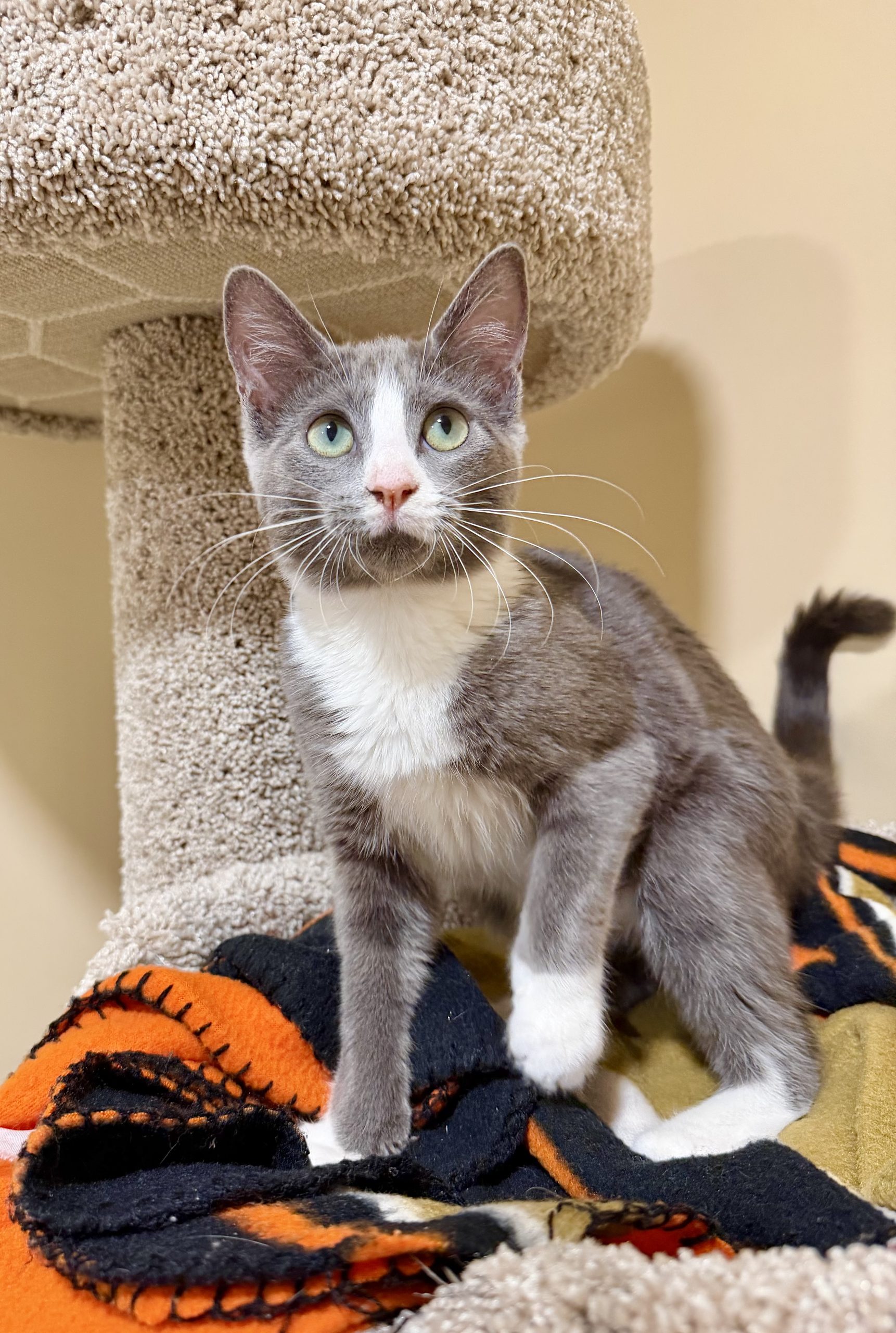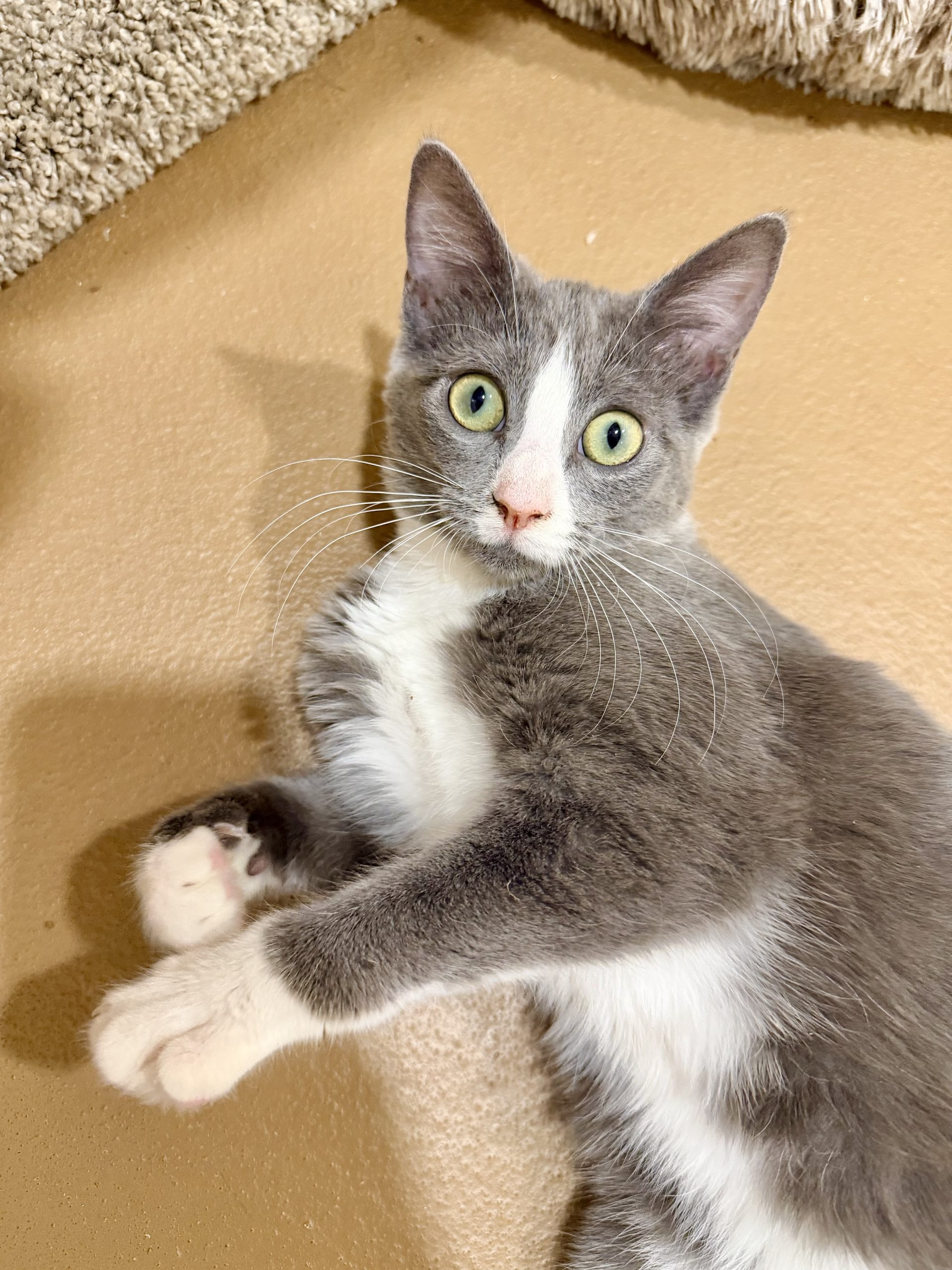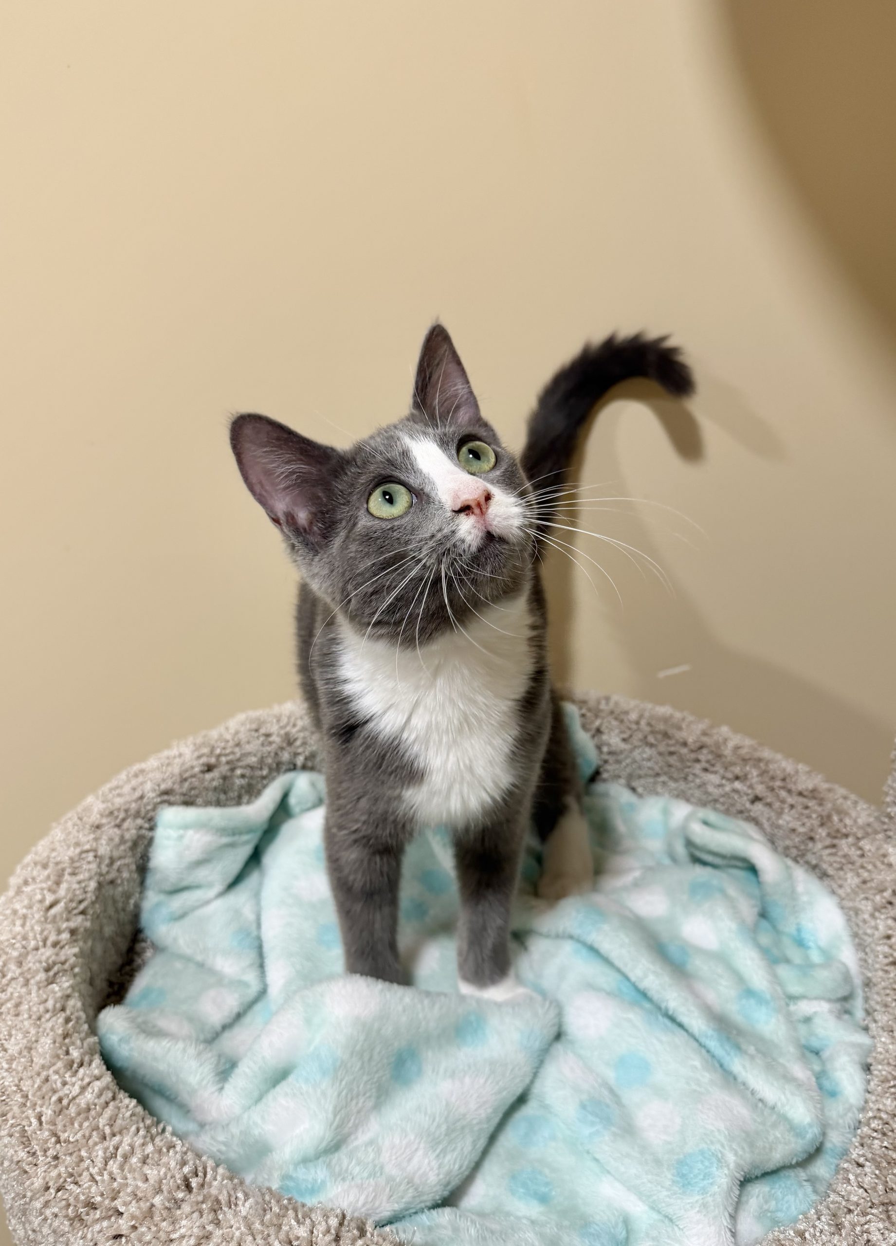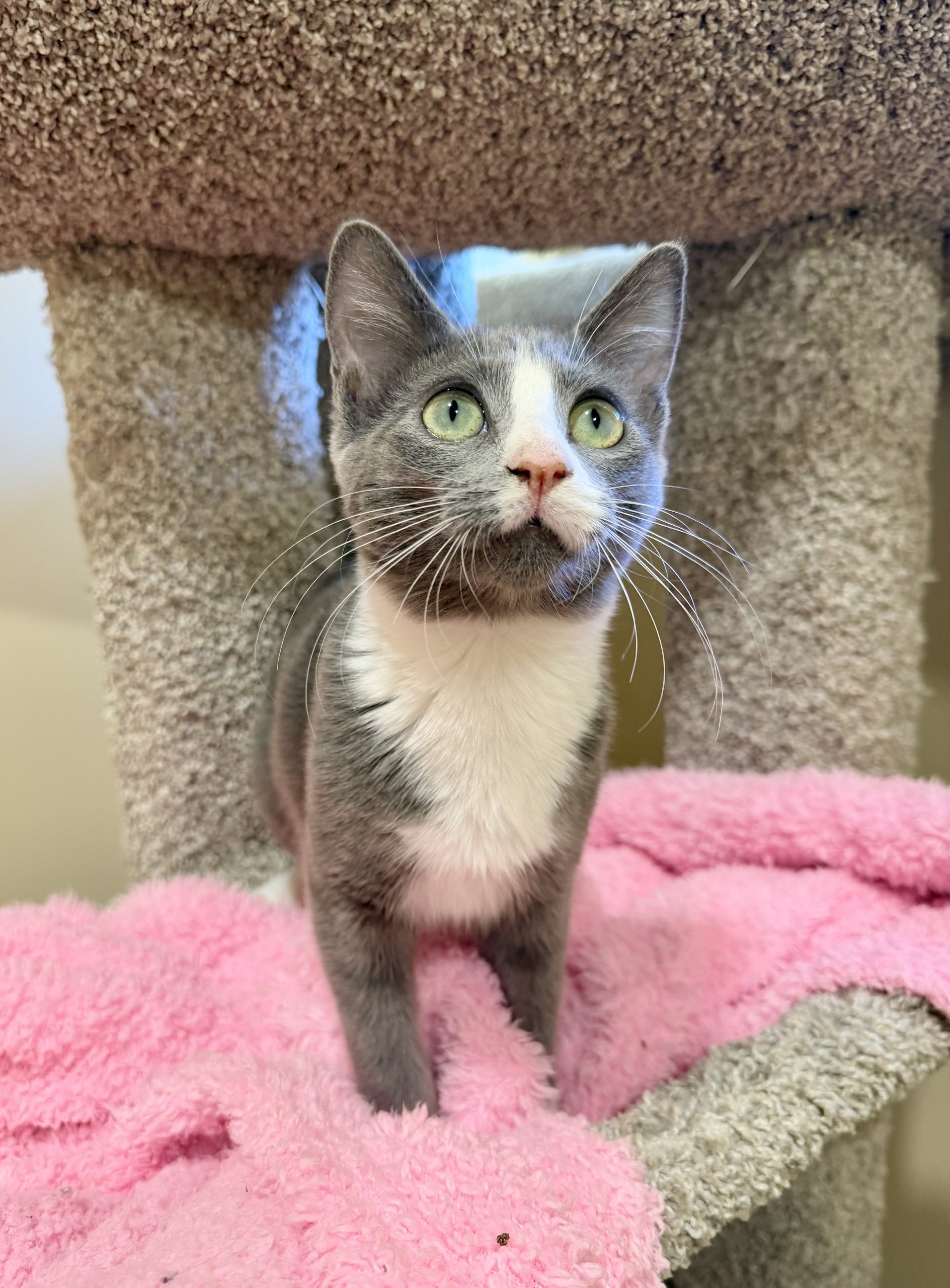 Cucumber is a 5 month old grey and white Domestic ShortHair kitten who’s as sweet as she is adorable. This friendly little rescue girl loves meeting new people and showing off just how cute she can be. Whether she’s batting around her favorite toys or trotting proudly around her kitten suite, Cucumber brings joy to everyone who sees her. Affectionate and playful, she’s the perfect match for anyone looking to add a loving companion to their home. Cucumber is up to date on vaccinations, microchipped, and will be spayed soon. If you’re ready for the fun and responsibility of welcoming a new kitten into your life, come meet Cucumber today, she can’t wait to charm you!