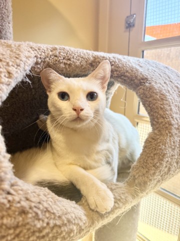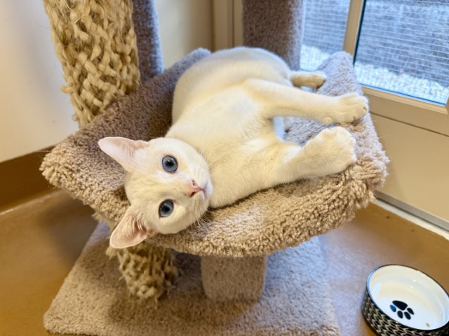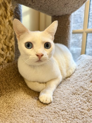 Say hello to Dove, a 1 year old domestic short hair with the most stunning blue eyes you’ve ever seen! This gorgeous 10 pound girl isn’t just beautiful, she’s also one of the sweetest, most affectionate cats you’ll meet. Dove loves being around people and will happily soak up all the pets and cuddles you’re willing to give. Her gentle, easygoing personality makes her the perfect companion for just about any home. Whether you’re lounging on the couch or working from home, Dove will be right by your side, purring away. Dove is spayed, microchipped, and up to date on her vaccinations, so she’s all set and ready to find her forever family. If you’re looking for a loving, loyal little friend with eyes that could melt your heart, Dove is your girl!