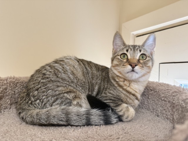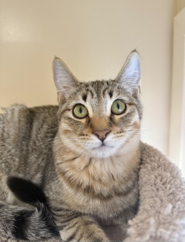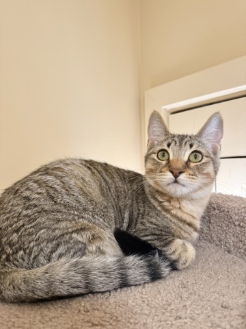 Falcon is a 5 month old Domestic Shorthair rescue kitten with a calm and tender spirit. This sweet boy may be a little shy at first, but give him a bit of time and a quiet space to settle in, and you’ll quickly see his affectionate side shine through. Sit near him, and soon enough, he’ll be brushing up against you, asking for gentle pets. Falcon’s laid back demeanor makes him the perfect match for a calm, quiet home where he can feel safe and loved. Once comfortable, he blossoms into a loving, loyal companion who just wants to be near you. He’s neutered, microchipped, and up to date on all his vaccinations, ready to start his next chapter with someone special. If you’re looking for a gentle soul to share your home and heart with, Falcon may just be your perfect match.