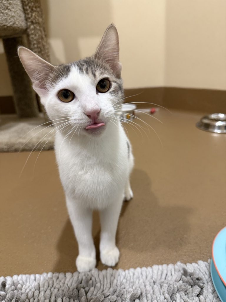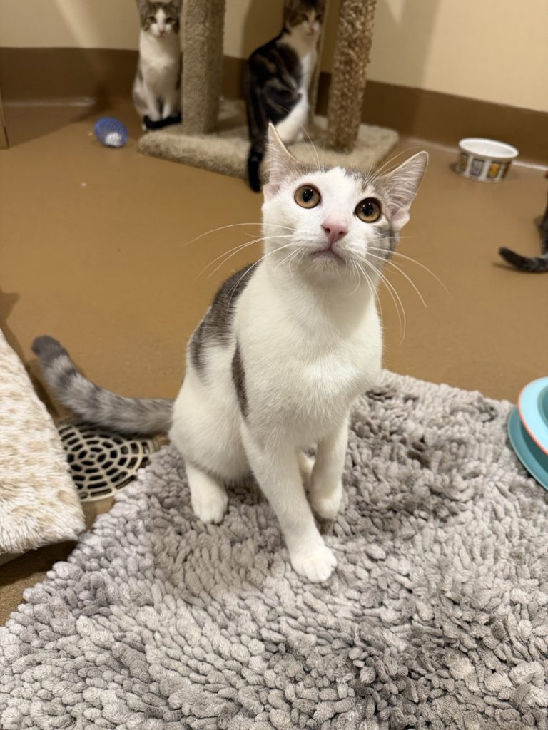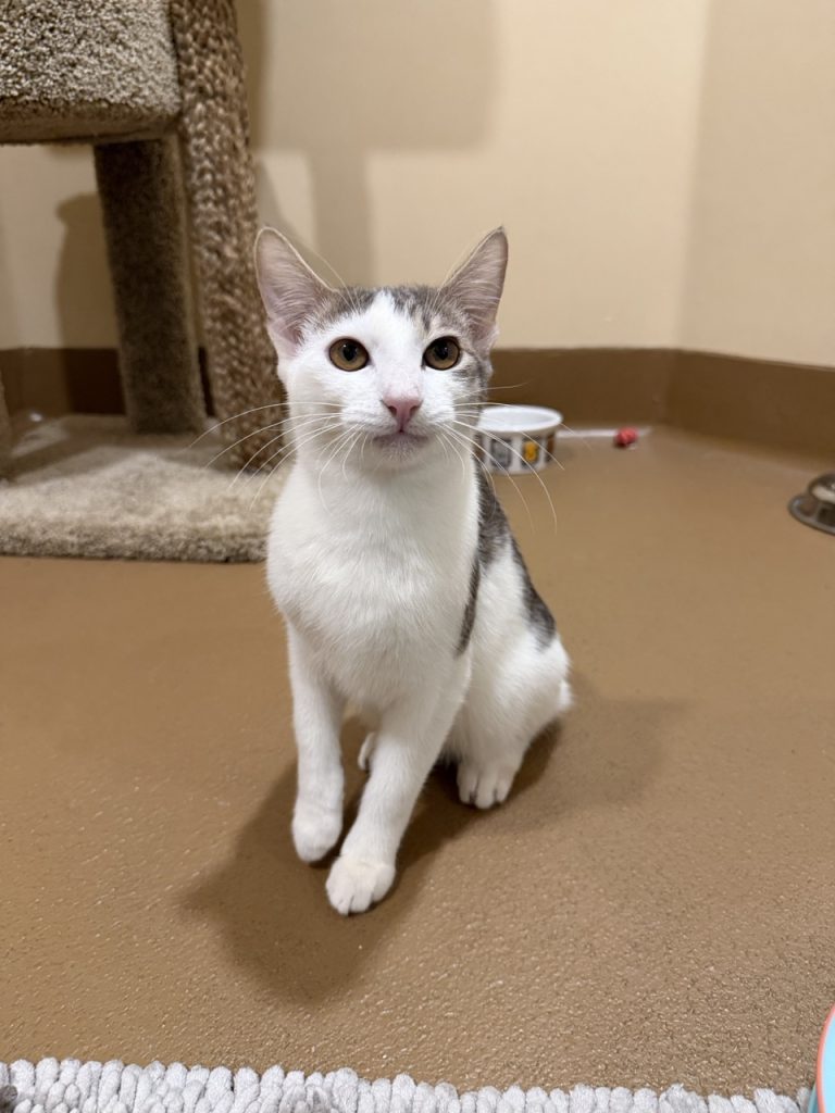 Guitar is a sweet 5 month old grey and white Domestic Shorthair kitten with a playful, gentle spirit and a wonderfully silly personality. He may be a little reserved at first, but once Guitar comes out of his shell and learns to trust you, he’s full of loving warmth and affection. He’s playful and fun while still being soft and gentle, making him a joy to be around. Guitar loves getting cozy in blankets and curling up in a cat bed, especially after a good play session. He’s the kind of kitten who brings both smiles and comfort to a home. Guitar is microchipped, up to date on vaccinations, and already neutered, and he’s ready to find a loving family to call his own.