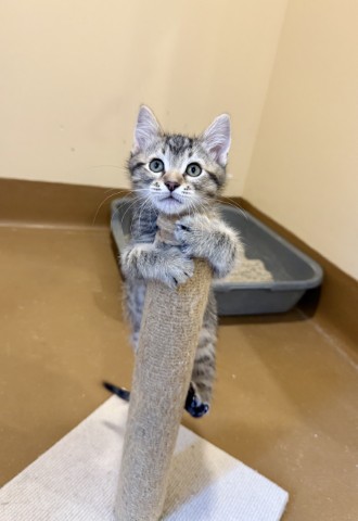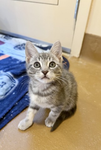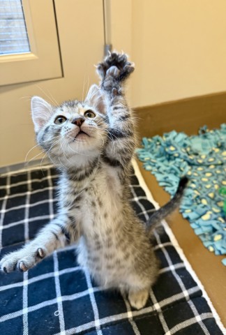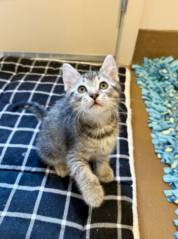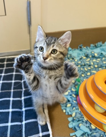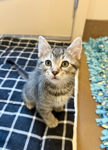 This one-month-old domestic shorthair tabby is a frisky, loving little cutie all wrapped up in a tiny package! Gyro is full of kitten energy, he loves to play, explore, and hop around, bringing joy and laughter wherever he goes. When he’s not pouncing on toys or chasing imaginary friends, he’s happy to curl up for some well-deserved snuggles. Gyro is up to date on vaccinations, microchipped, and neutered, all ready to start his next adventure with his forever family! He’s looking for someone who’s ready for the fun (and a little bit of chaos!) that comes with raising a playful kitten.
