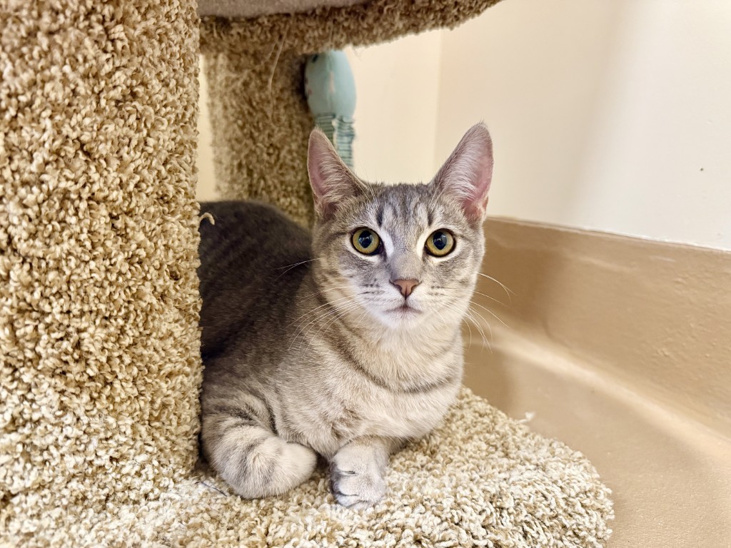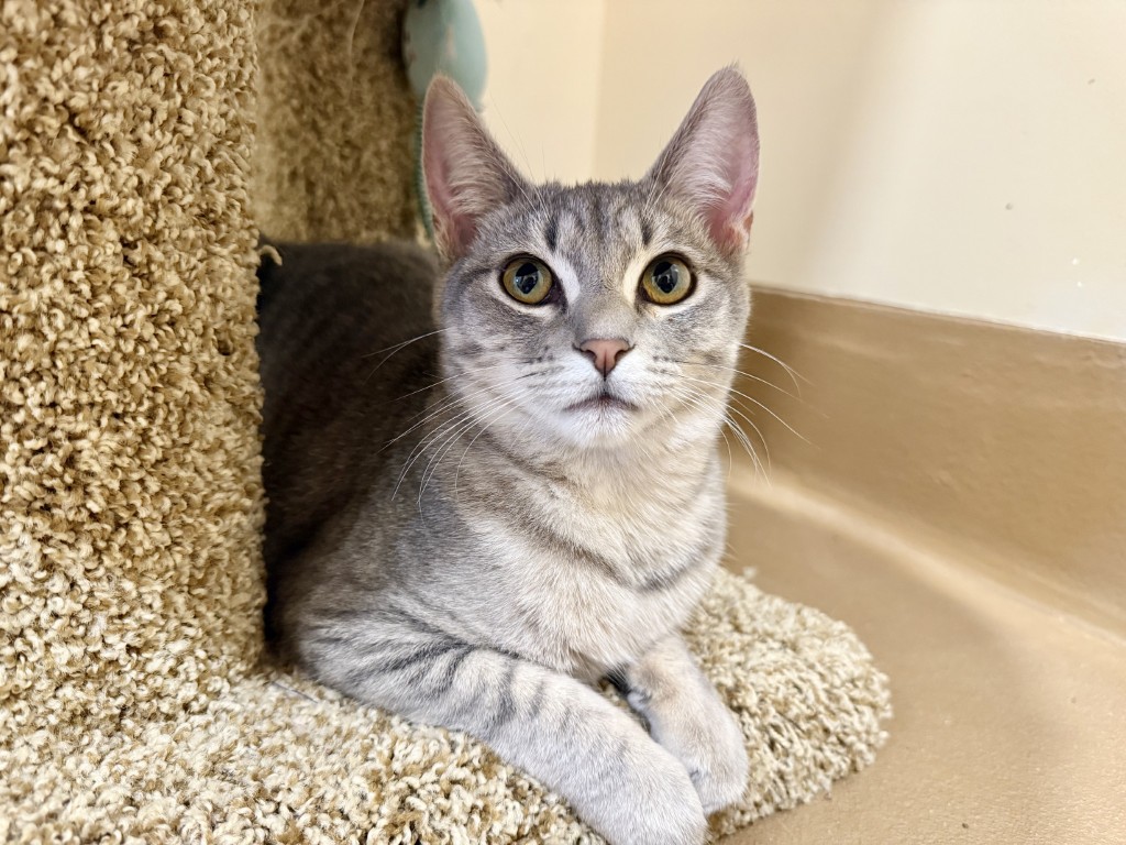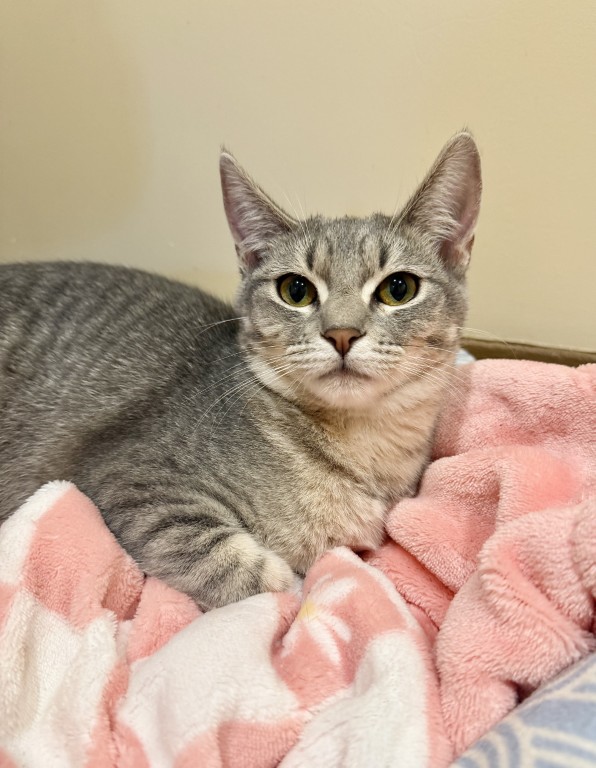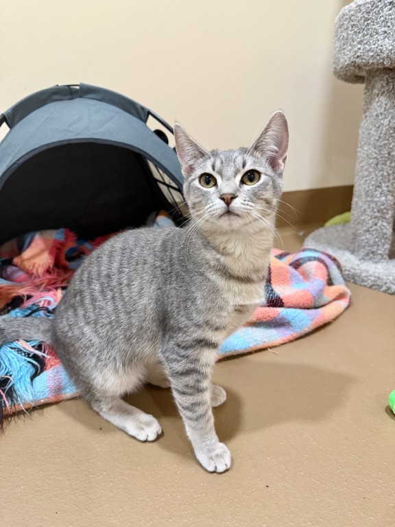 This 5-month-old grey beauty is a Domestic Shorthair with a heart as soft as her fur. Kix is a mellow soul who prefers lounging in cozy corners over joining her rambunctious siblings in play, she’s far too poised for all that chaos! While she can be a bit timid at first, Kix just needs a gentle, patient adopter who will give her the time and space to come out of her shell. Once she warms up, you’ll see her affectionate, loving side shine through. Kix would thrive in a quiet, easy-going home where she can feel safe and adored. She’s already spayed, microchipped, and up to date on all her vaccinations, all she’s missing is her forever person. Could that be you? Come meet Kix and let her charm you with her quiet grace!