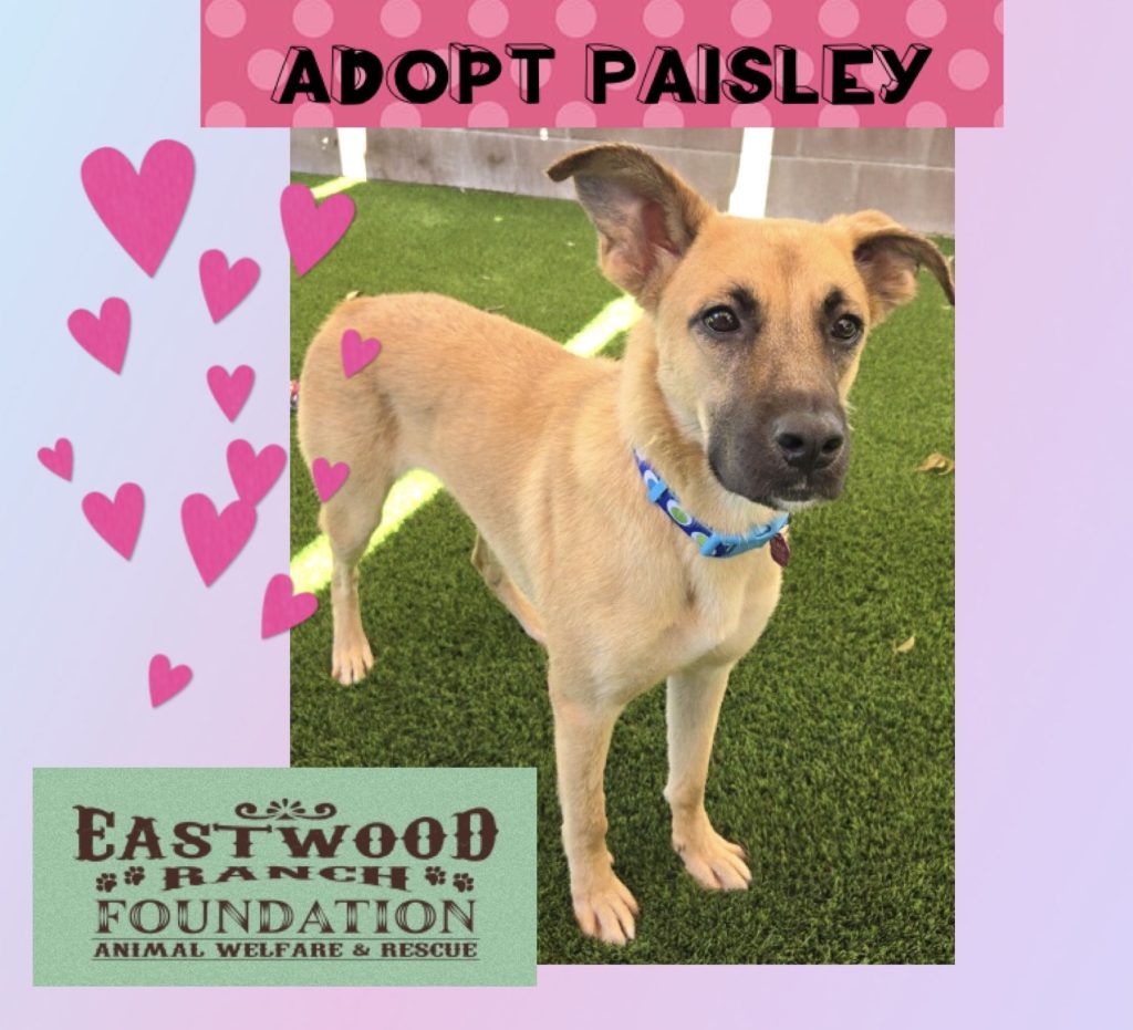 Paisley is an 1 and a half year-old, 45 pound, beautiful, sweet, unique breed called Black Mouth Cur mixed with Shepherd. She is great with people, loves to play with dogs and is good with cats. Great on leash, housebroken, spayed, chipped and has her shots. Very special girl!