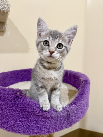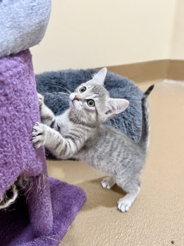 Percy is a 2 month old gray Domestic Shorthair kitten who’s ready to find his forever family! This little guy is spunky, sweet, and funny, all wrapped up in one tiny, adorable package. He loves to romp around and play, then jump right into your lap for snuggles and a well-deserved cat nap. Percy’s the perfect mix of playful energy and cuddly affection. If you’re ready for the joy (and responsibility!) of welcoming a new kitten into your life, come meet Percy today, you’re sure to fall in love! Percy is up to date on vaccinations, microchipped, and will be neutered soon.