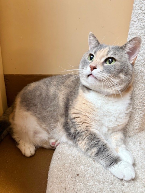 Poppy is a gorgeous 13lb torbie domestic shorthair with a calm, soulful presence. Like many cats, she prefers to take things at her own pace and is looking for an adopter who understands that trust is something earned with patience and kindness. Independent by nature, Poppy would thrive in a quiet home where she can settle in. Once she feels safe, her sweet and loving side truly shines through. Poppy is a laid back girl who enjoys spending her days lounging in her cat suite and taking life easy. She’s low maintenance and would make a wonderful companion for someone who appreciates a relaxed cat. If you’re willing to give Poppy the time and space she needs, she’ll reward you with quiet companionship and affection on her own terms. She is up to date on vaccinations, microchipped and spayed!