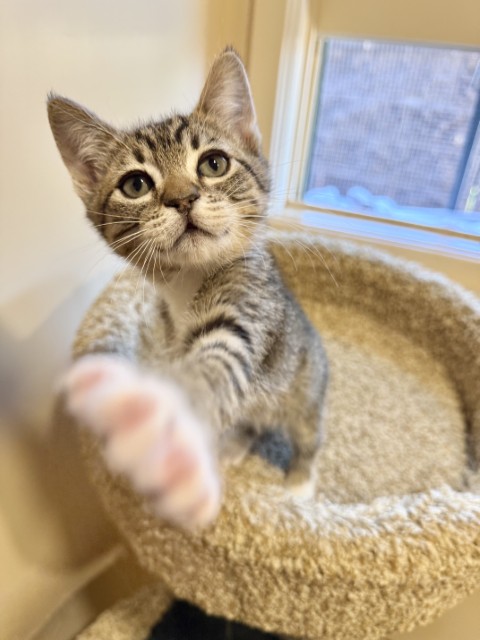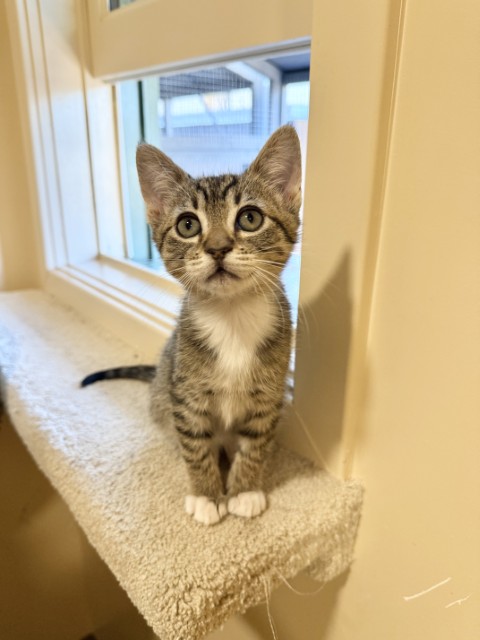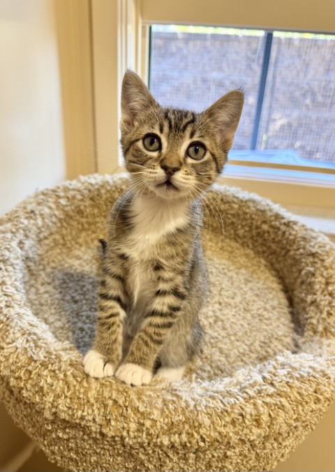 Sriracha is a 2 month old domestic shorthair tabby girl with a heart as warm as her name. This tiny sweetheart is the perfect blend of playful energy and snuggly affection. She loves romping around with her siblings and curling up for cozy naps just as much. Sriracha’s favorite place to be is cuddled up with her humans, and she’s eagerly waiting to find a forever family to shower with love. She is up to date on vaccinations, microchipped, and scheduled to be spayed soon. If you’re looking for a loving, cuddly kitten to brighten your home, Sriracha may just be your perfect match!